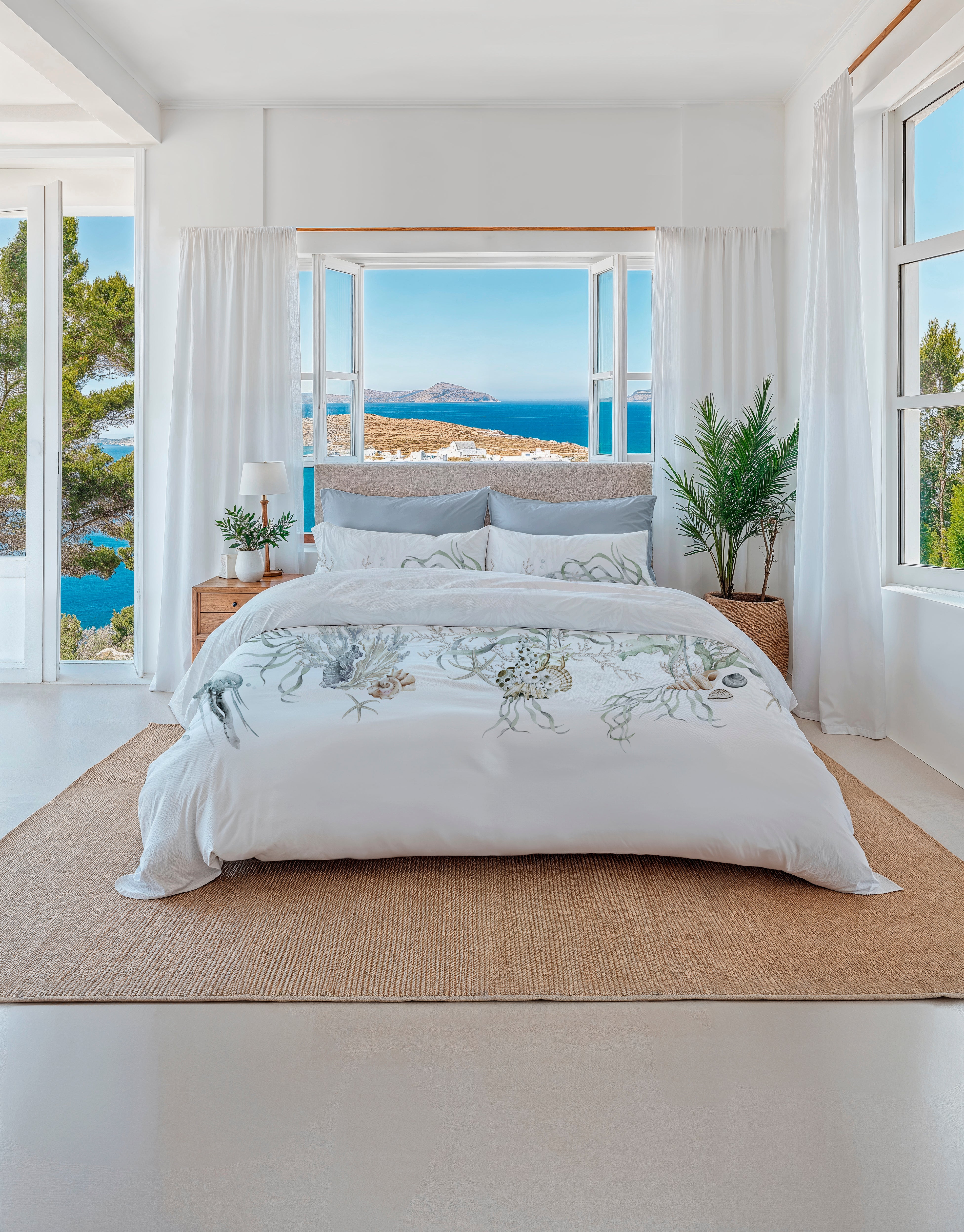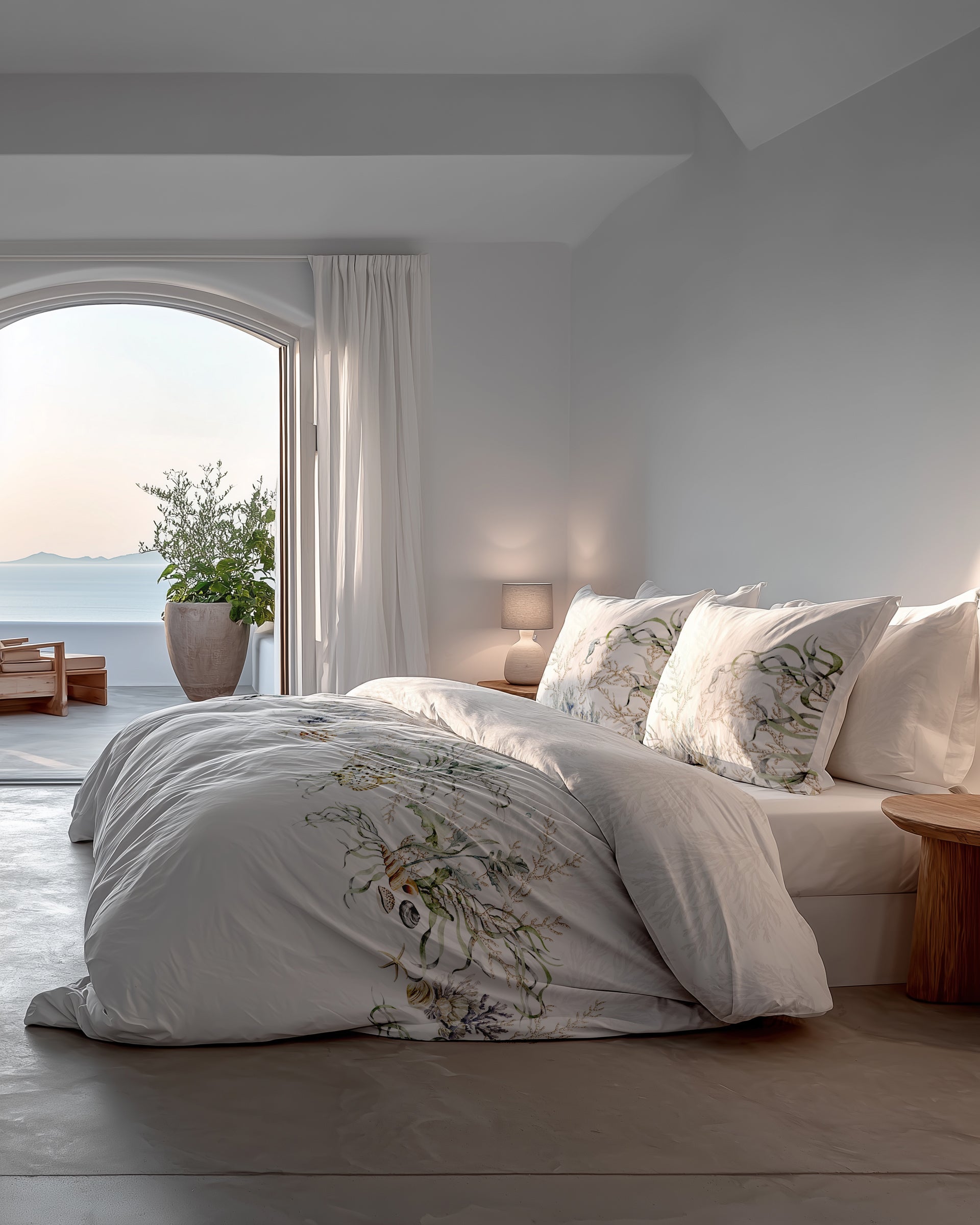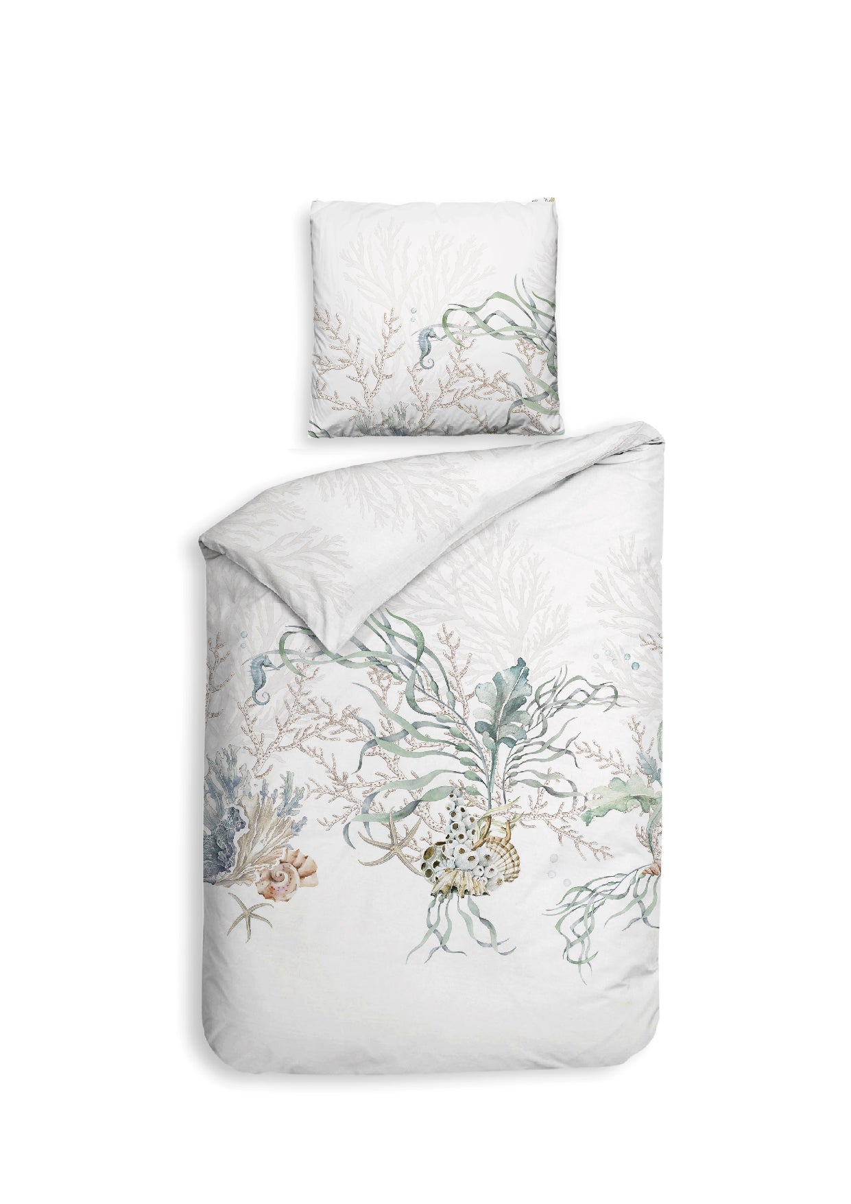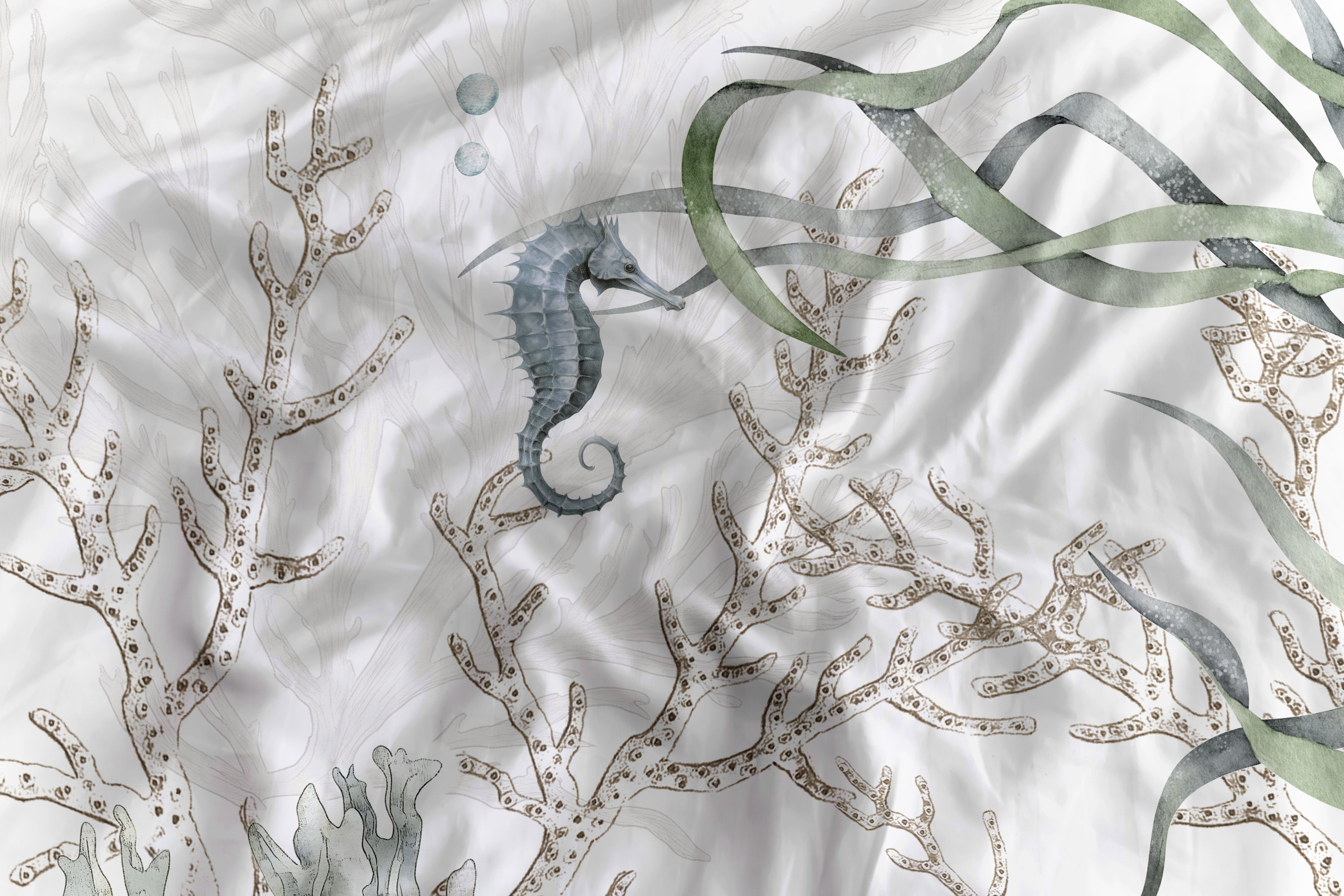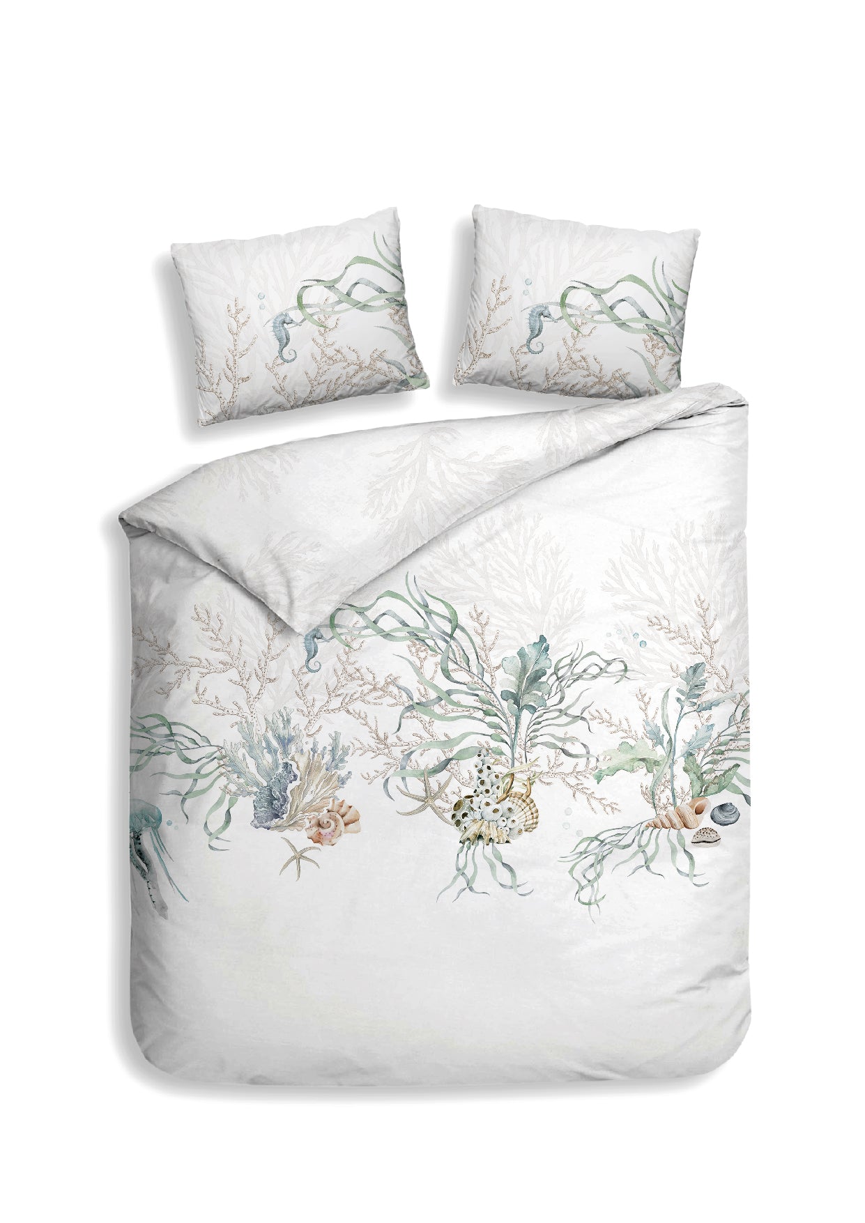 Met dekbedovertrek Agnia breng je het rustige eilandgevoel van Milos naar je slaapkamer. Op een zachte witte basis komen subtiele zeepaardjes, schelpen en zeeplanten tot leven in natuurlijke tinten. Gemaakt van 100% katoen-satijn voelt het dekbedovertrek heerlijk glad en comfortabel aan. Dankzij het dubbelzijdige ontwerp kun je eenvoudig afwisselen van sfeer. Geleverd met bijpassende kussenslopen voor een complete look.