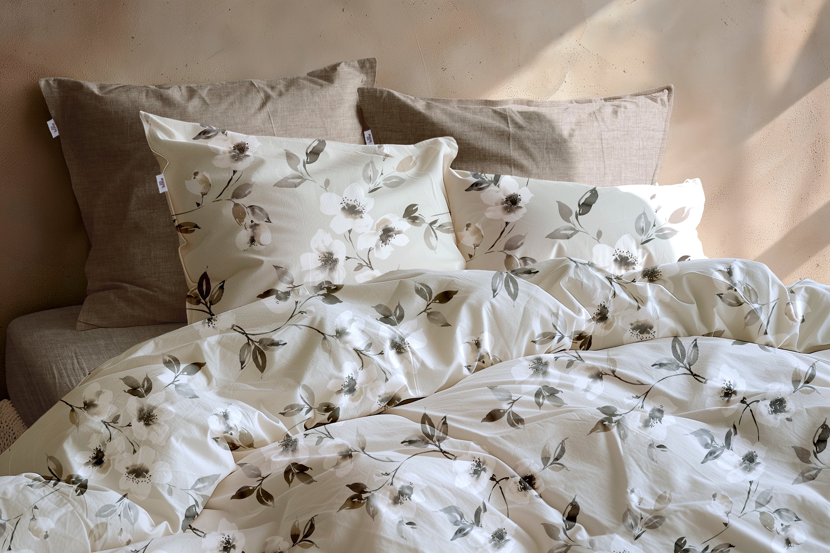 Dekbedovertrek Ines van Zohome heeft een bloemenprint in neutrale kleuren, perfect om makkelijk te combineren in je...